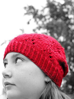 A lovely gentle slouch hat with a simple, easy to remember lace pattern knit in the round from the brim upwards.