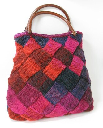 Entrelac Bag worked in one piece with one side seam and base seam. It is shaped by decreasing the stitches used in the squares. Yarn: 200g (approx 400m) of any aran-weight yarn; this yarn usually has a stocking stitch tension of 18 sts to 10cm (4in). Use variegated, multi-coloured, or handpainted yarns. Bag in photo uses Noro Kureyon.
