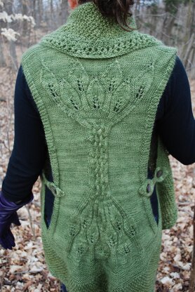 Less fussy than a shawl, less structured than a normal vest, this piece is greater than the sum of its parts. The back is a gorgeous statement of cabled branches and lacy leaves while the shawl border wraps you in a cascade of double moss stitch. With a customizable pattern that caters to every shape, and a lustrous mohair yarn that adds the perfect insulating layer, the wind is at your back... and you can’t even feel it.