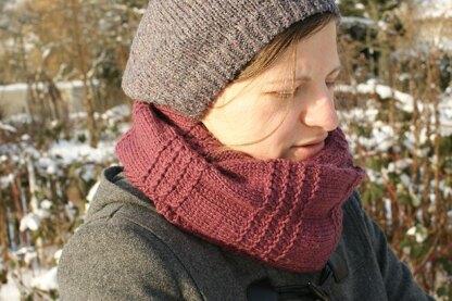 The Erika Cowl is knitted flat using a provisional cast on. The seaming is done by the three needle bind off. Both techniques are explained and demonstrated by a photo tutorial. The Erika Cowl is worn wrapped around the neck. It features sections of stockinette stitch and horizontal ribs. The finished cowl has a circumference of approximately 48" (122 cm) so that it does not fit too loosely around your neck and keeps you warm.