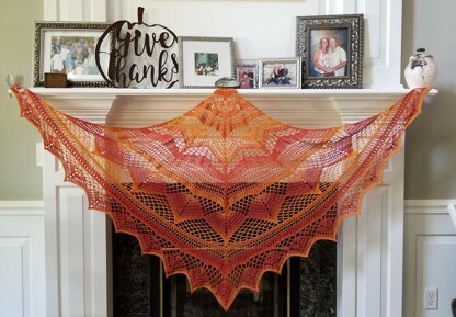 Hook size- D, 3.25 mm. Yarn- Cascade Heritage Wave, 100 g/ 437 yds. Colorway- Solar Yardage- 1250 total yds. Finished size- Approximately 90 inches wide, 60 inches tip to point, and 40 inches tall.