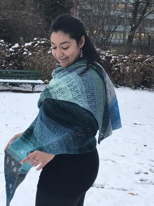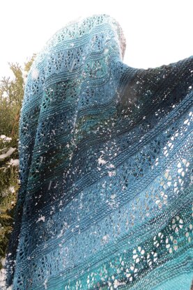 This very large, rectangular wrap is knit on the bias, with alternating lace and color fade panels. The increasing and decreasing lace sections represent the build-up of the snow storm, while the main lace panels represent the body of the storm, with an easy to remember lace pattern repeat.
