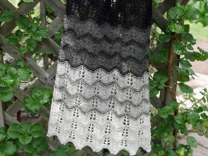 High energy weather and ocean activity shape the tall, striated rock cliffs around Eshaness and shroud their feet in pools of swirling, white foam. This scarf or stole, worked from hem to center back in two pieces, makes use of simple stitches and color sequences to replicate one of Shetland’s most exciting landscapes. Work the colors as stated in the pattern or devise an alternate scheme to add a personal touch; this design lends itself to endless variations and is easily resized to suit one’s yarn supply and/or ambition.