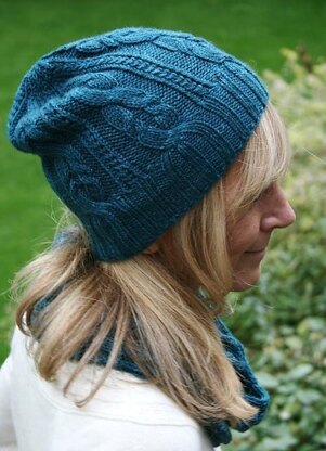 “Esme” hat has been created to match “Esme” cowl. It features all over cable design with a wide 2x2 rib brim.
