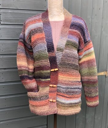 A beautifully cosy cardigan in a simple and quick to knit design with useful incorporated pockets. The main pattern consists of alternating bands of garter and stocking stitch. The sleeves are in stocking stitch and all borders are worked in garter stitch. Worked bottom up and with full written instructions.