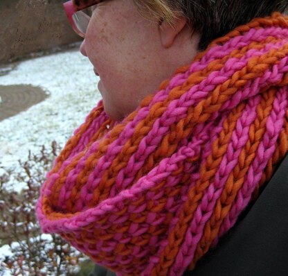 “Esprit” is an anagram of “stripe.” Worked up in school colors, this striped cowl (or scarf) will rock the team spirit look. Or use more subdued colors for a more sophisticated look. This piece works up quickly in a bulky or super bulky weight yarn, producing a textured, reversible, and, yes, flat fabric. Even though it looks complex, the stitch pattern is basically a 2-row repeat and only 1 color is worked at a time. The stitch is a modified version of stockinette brioche stitch – resulting in an even more interesting reverse side. A video tutorial is available at www.verdigrisknits.com.