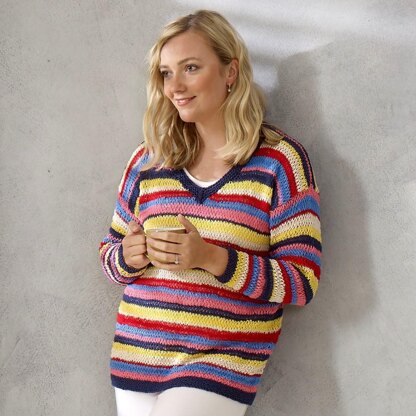 Estelle is a striped long sleeved sweater. It is knitted in a striped open work pattern formed by using two different sized needles.