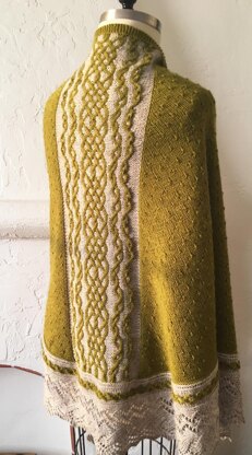 This top-down shawl, with a two-colored cable center section, just begs to be wrapped around you!