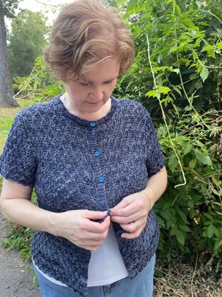 Yarn: Euphoria Knits DK Frenzy, 85% Superwash Merino/15% Nylon; 246 yards/100g. Amount needed for long-sleeved 4(5, 5, 6, 7, 7) skeins. Short sleeve will take less. Short sleeved 44” sample (in River Styx) used 400g/ 990 yards.