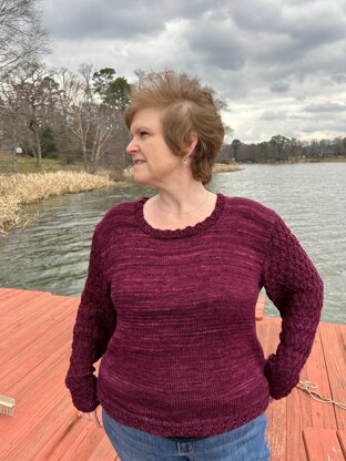 Yarn: Euphoria Knits DK Frenzy, 85% Superwash Merino/15% Nylon; 246 yards/100g. Amount needed for long-sleeved 4(5, 5, 6, 7, 7) skeins. Short sleeve will take less. Long-sleeved 44” sample (in Bacchus) used 552g/1350 yards.