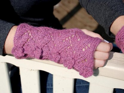 These simple sideways mitts are a great introduction to chart reading for new lace knitters. The knitted flower embellishments are easy to work, but add a pinch of pretty to these comfortable mitts.