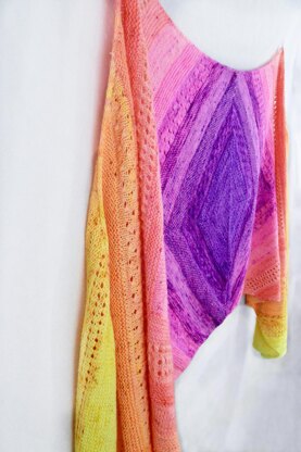 Evanesce was inspired by the long summer days of sunshine and the vibrant colors that illuminate the sky. Shawl was designed for a fade mini-skein set, but makes a great stash buster. If using mini skeins note the patten used almost all yardage from each skein. Pattern is worked from the center out. Once width is reached, shawl is worked flat.
