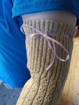 These sleeves are worked from the top of the arm down. The top is worked with a K 2, P 2 rib to hold it up like a sock. If however you choose a yarn that is mostly silk, as I did, you will want to put the eyelets in and run the ribbon through to keep the sleeves in the proper position. There is some decreasing to shape the arm to keep the fit close as you work your way toward the cuff. The bind off is crocheted with some chain loops for a lacy look at the wrist.
