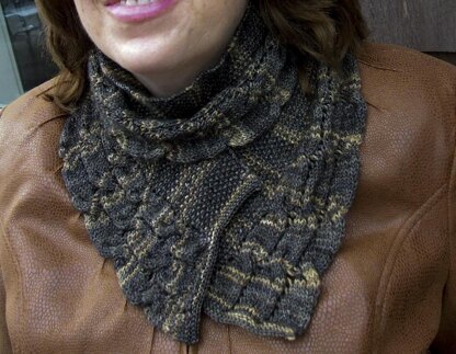 Pattern Details: Yarn: Knit Picks Hawthorne (80% Superwash Fine Highland Wool, 20% Polyamide, 357 yards/100 grams) or a fine sock yarn Gauge: 35 stitches = 4” (10cm) in pattern Needles: US Size 4(3.50mm) Notions: Tapestry needle and cable needle Sample Blocked Finished Size: 46" (117 cm) long, 5" (12.5 cm) wide.