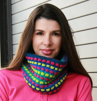 Inspired by the brightly colored candies from Willy Wonka’s Chocolate Factory, the Everlasting Gobstopper Cowl features fun textural bumps in bright colors. The interior lining of the cowl features rando