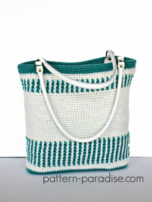 This tote bag is completely reversible and has two unique sides so you can quickly change up your look. One side has a fun twist on a basic chevron, the other a tapestry look. I added purchased leather handles, but you could crochet handles if you prefer.