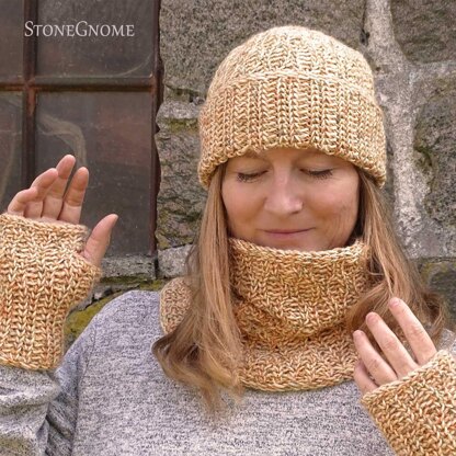 A UNIQUE and lovely accessory set of hat, cowl, and fingerless gloves. Now also including the ear warmer.