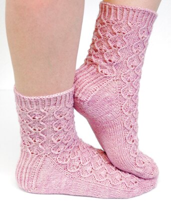 A stockinette toe gradually transforms into a stitch pattern with tiny buds surrounded by wavy twisted stitch columns. The heel flap is worked in a variation of twisted ribbing, morphing seamlessly into the main stitch pattern and flowing beautifully into a short twisted-rib cuff.