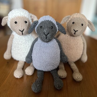 These Knitted Sheep have been created using a fleece/snowflake chunky type yarn. Contrast DK for the head, ears and legs. Approx height is 21cm when sitting. You can use any Fleece type yarn using the gauge as a guide. You may end up with a larger or slightly smaller version if not using the exact yarn used. Any DK yarn can also be used. 1 x50g Ball Sirdar Snowflake chunky, 25g DK contrast yarn, Approx 60g toy stuffing, 9mm Safety eyes, Needles used 4.5mm and 3mm, Worked flat and seamed. NOT just for children! Can just sit on a shelf too.