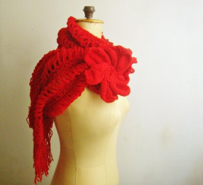 A knitting pattern for my original red lace scarf with fringe and big flower brooch. It's fashionable, chic and you can wear it in many different ways. It's great handmade gift too.