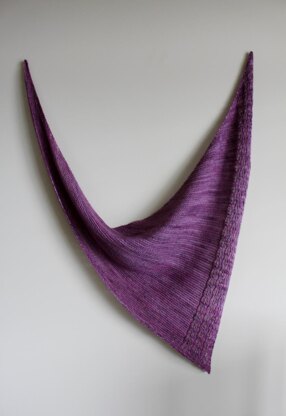 This asymmetrical garter stitch shawl is a quick and easy project that starts at one corner, increases along the top edge, and finishes on a long side edge creating a deep triangle shape. A pretty eyelet chain lace pattern follows along the other edge. This is a fun project that will highlight any pretty skein of yarn. Pattern includes notes, list of abbreviations, diagram, and both written and charted instructions. This pattern uses one skein of Madelinetosh Tosh Merino Light. The sample is shown in Night Bloom. Skills required: increasing, basic lace, blocking. Stitches used: k, p, sl1, kfb, k2tog, ssk, yo.