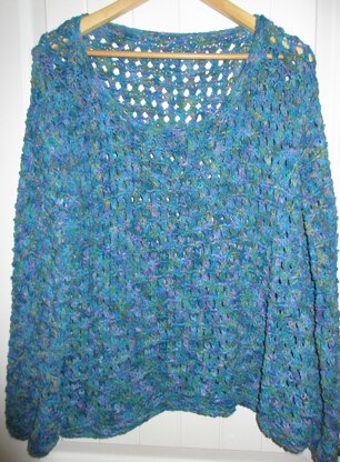 This is a pattern for an eyelet lace jumper, originally published in Knitting magazine. It has a simple eyelet lace pattern. They yarn is an interesting tape yarn, but the design would work just as well in a solid yarn. Length 54-61 cm.