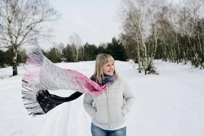 Find your favorite finest weight fiber for fun with fading then finish with feather-and-fan! It’s easier knit than said! Basic garter stitch is gussied up with feather soft lace weight cashmere, gorgeous speckled colorplay, bias shaping, and a hint of lace. Then wrap yourself in simple luxury.