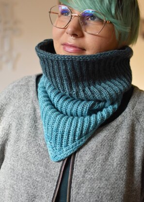 The cowl is knit drop-down in four fading colors. It sits close to the neck and has a light bandana-shape at the lower edge that covers the neckline and keeps the chill out.