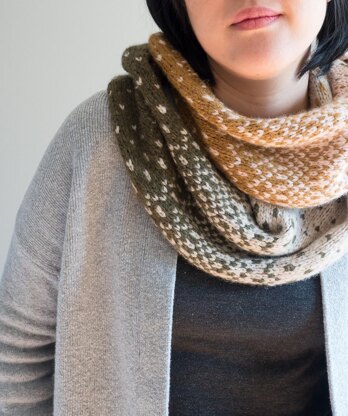 The Fading Waves Cowl is a mixture of colorblocking and fairisle stranded knitting. Four colors blend into each other through a simple fairisle design.