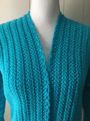 - I LOVE the teal color. This Cardigan uses the Herringbone Double Crochet that creates a tight stitch so it will keep you warm and toasty.