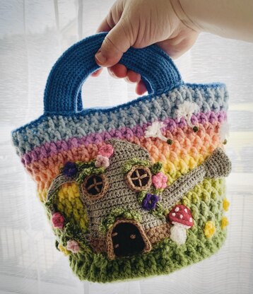 This unique and darling bucket style handbag, crocheted from base up in rounds using the lovely textured Alpine Stitch (with a twist to the technique), colour changes to capture a sunset on a summers evening and stunning appliqués will be a head turner wherever you go. A beautiful gift for any fairy friend.