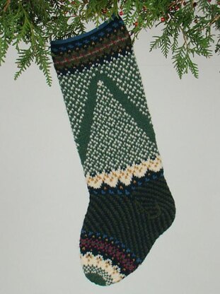 PATTERNS provide clear written instructions, along with color charts for each colorway, to knit a Christmas stocking in the round. Stockings measure approximately 20"x7", varying in size with individual designs.