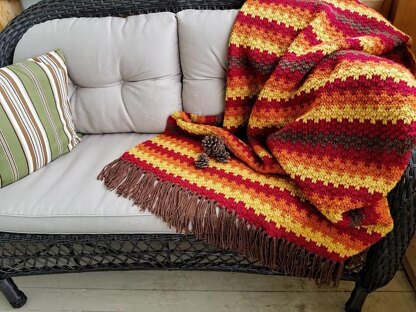 This stitch pattern creates a solid and thick fabric, perfect for fighting off that Autumn chill. For the majority of the blanket, you will use only single crochets and double crochets. Only the final row uses single crochets and half double crochets. The staggered stripes create visual interest and because of the four rows per stripe pattern, all of your ends are on one side of the blanket. You can crochet over them as you work or weave them in at the end, but your not searching all over the blanket to find all of the ends. The fringe is optional.
