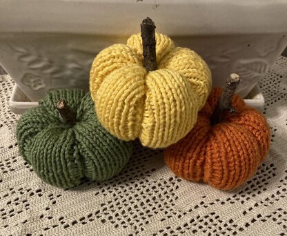 Pattern notes: The only stitches used in this pattern are the knit stitch and the purl stitch. The pumpkin is knit flat and then stitches are gathered on one end, sewn up the side and stuffed, and then beginning stitches are gathered and secured to achieve the look of a pumpkin. The stick is then glued into place to finish.