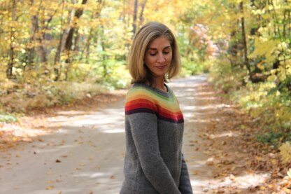 Fall Stripes Sweater is worked from the bottom up in the round. First the body is worked straight to the underarms. Next, two sleeves are made, then knitted on to the body. Short rows are worked to start shaping the back of the yoke. Once the yoke is finished a few more short rows are worked to raise the back of the neck.