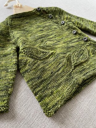 Falling Leaves is a cute little unisex knitted baby cardigan featuring angled, textured leaves that appear to drift down the front. The knitting pattern is suitable for a single skein of hand-dyed variegated sock yarn.