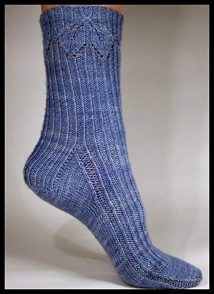 Sock is worked cuff down with a heel flap and gusset construction. Pattern assumes you can knit in the round on double pointed needles, pick up stitches, use a cable needle and are comfortable following a chart for the 20 rows of the leaf pattern.