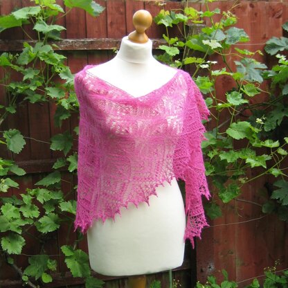 Шаль вяжется сверху вниз, имеет треугольную форму. Рекомендуется пряжа из натуральных волокон, метраж 600 – 1000 м в 100 г. Размер шали регулируется количеством повторов одной из схем. Расход пряжи для шали 900 – 1200 м Рекомендуемый размер круговых спиц 2,5 – 4 мм. Крючок 1,5 мм для закрытия каймы.