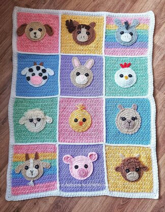 This fun blanket is made by making squares using the lemon peel stitch, then joining with a simple slst. It features 12 different farmyard themed animals that are sewn on each square.