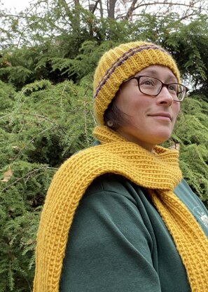 MATERIALS: 120-200g worsted weight yarn: Shown above in Valley Yarns Northampton (100% wool; 247 yds [226 m]/100 g [3.53 oz])“ color 15 Gold: 2 skeins. Two 100g skeins will make a hat & scarf set. U.S. 8 (5.0 mm) knitting needles Darning needle