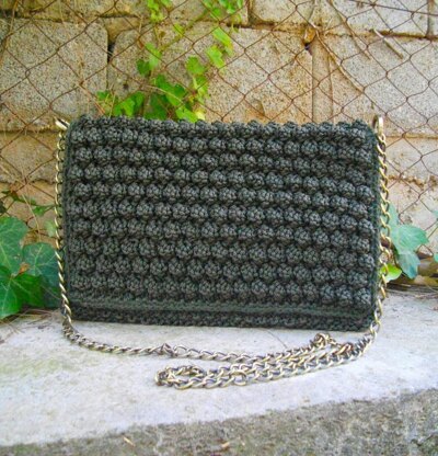 Finished size: 11.5"/29cm W x 7.5"/19cm H, base 11.5"/29cm W x 3.6”/9.5cm H, flap is 6.6’/17cm H Yarn: 100% polyester macramé cord, category worsted, 100gr (3.5 oz)/160 m (174 yds): 5 skeins in dark green. Needles: US 8 (5mm).- Adjust needle size to obtain correct gauge. Hook: US 7 (4.5mm). Notions: tapestry needle, a piece of plastic stiffener 11.7"/30cm W x 19.7”/50cm H, fabric for lining, matching sewing thread, a pair of brass spring ring clasps (inner diameter 20mm), a brass chain 10mm width 47" (120cm) long, sewing needle, sewing machine, 2 magnetic clasps. Gauge: 12 sts x 24 rows = 10x10cm, in bobble pattern with 5mm needles, 16 sts x 26 rows in basic pattern. Level: intermediate