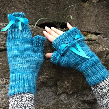 Fastened, and faster. Plain stockinette mitts with a twist. Knits up quickly for gift giving... or cold hands. With the top ribbing folded down, they're fingerless mitts. With the ribbing up and the drawstring tied tight: they're mittens, with none of the palm bulk, buttons, or drafts that come with most fold-over-top style convertible mitts. All of this wrapped with a bow. The top of the thumb is also a tube of ribbing which can be folded up or down. Written pattern includes 3 adult sizes, ideas for customizing your mitts, and detailed tips for changing size or gauge.
