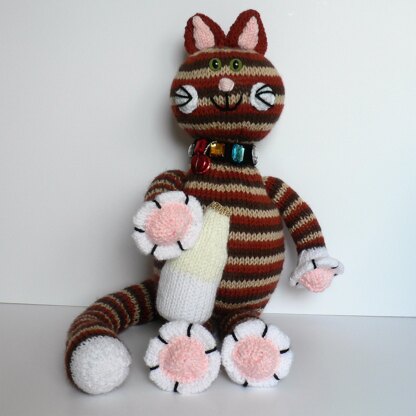 - I used stitch-on gemstones to decorate Fatcat's collar, plus a small bell. The gold milk bottle top is made with an oddment of metallic yarn