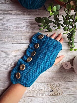 This is a written pattern in basic knitting terms. It is a beginner-friendly pattern. These mitts are knit from side to side. No need to seam at the end the buttons close up the side. One side is knit into a cute ruffle and the other has six buttons you will sew on after knitting. This pattern uses size US 8 needles 5 mm and worsted weight yarn. They come in one size for an adult. They are extremely stretchy and will fit most adult hands. I love these mitts because they are super easy but come out being a remarkable accessory.