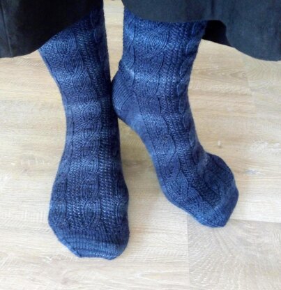 [EN] These socks feature a wide cable that is worked without twisting the stitches. You only need knits, purls, yarn overs and decreases. This makes for a stretchier fabric than with real cables and those socks will fits comfortably in shoes. Chart reading required.
