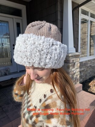 Have you been wanting a warm hat for liezure walks that looks great? This beautiful fur band adds warmth as well as style. It also looks great worn with a dress coat. It's a quick knit and you'll be tempted to make them for gifts as its so becoming on nearly everyone.