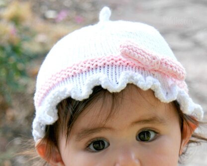 A ruffled cast on is followed by simple stockinette stitch. The “ribbon” is knit as you go and the “bow” is knit separately and sewn on.