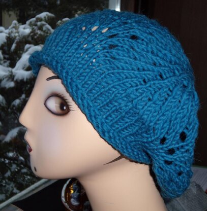 This relaxed beret uses bulky yarn and a beloved stitch pattern to produce a lovely lace cap. Feather and Fan is a favorite of knitters for both its beauty and its easy to memorize pattern. Size M uses 5 repeats of the pattern, while size L uses 6 repeats. The beret is shown here worn loose and slouchy after blocking the lace (but not the brim). If you choose to have a more head-hugging hat, then do not block when finished, and you'll have a wonderfully textured warm lace cap.