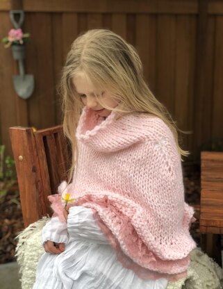 his beautiful cape is worked in the round, from the top down. It is a bit oversized to create beautiful draping. This pattern is written for children's sizes 4-8 and 8-12. Finished measurements: Sizes 4-8: 17” from the top to the bottom 17” around the turtleneck 28” around the chest Sizes 8-12: 21” from the top to the bottom 20” around the turtleneck 34” around the chest The pattern requires U.S. Size 13 circular knitting needles, a tapestry needle and any weight 6 yarn,About 300 yards. This pattern also includes instructions on using optional 3" lace.