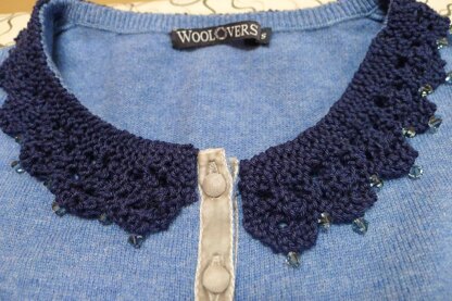 This simple knitted collar will transform a plain cardigan or short sleeve jumper into a vintage star. Embellished with beautiful Swarovski beads it will brighten up your spring and summer wardrobe. Using less than a ball of 4ply cotton and 40 Swarovski beads it is not an expensive make and would also make a lovely gift. You can easily adjust the length of the edging to fit your chosen garment. This beautiful edging would also look very pretty along the edge of towels or if done in a finer cotton around tablecloths or serving cloths. It is very versatile.